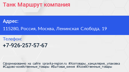 Танк Маршрут, компания по адресу 115280, Россия, Москва, Ленинская Слобода, 19 в дальнейшем Организация, размещена в следующих категориях: