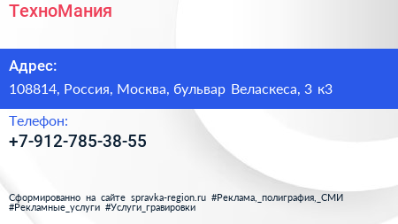 ТехноМания по адресу 108814, Россия, Москва, бульвар Веласкеса, 3 к3 в дальнейшем Организация, размещена в следующих категориях:
