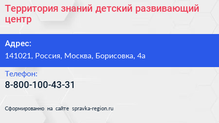 Территория знаний, детский развивающий центр по адресу 141021, Россия, Москва, Борисовка, 4а в дальнейшем Организация, размещена в следующих категориях: