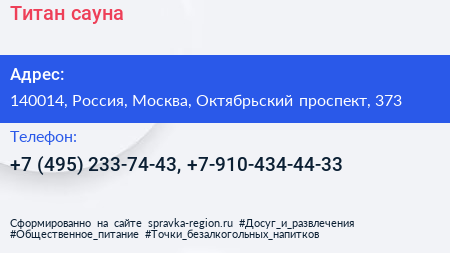 Титан, сауна по адресу 140014, Россия, Москва, Октябрьский проспект, 373 в дальнейшем Организация, размещена в следующих категориях: