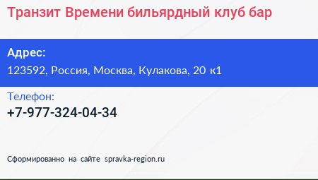 Транзит Времени, бильярдный клуб-бар по адресу 123592, Россия, Москва, Кулакова, 20 к1 в дальнейшем Организация, размещена в следующих категориях: