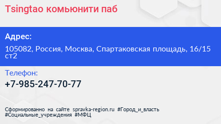Tsingtao, комьюнити-паб по адресу 105082, Россия, Москва, Спартаковская площадь, 16/15 ст2 в дальнейшем Организация, размещена в следующих категориях: