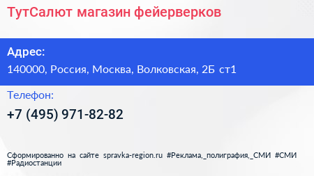 ТутСалют, магазин фейерверков по адресу 140000, Россия, Москва, Волковская, 2Б ст1 в дальнейшем Организация, размещена в следующих категориях:
