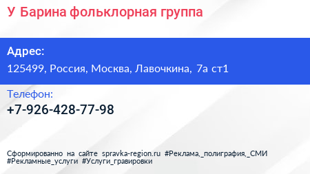У Барина, фольклорная группа по адресу 125499, Россия, Москва, Лавочкина, 7а ст1 в дальнейшем Организация, размещена в следующих категориях: