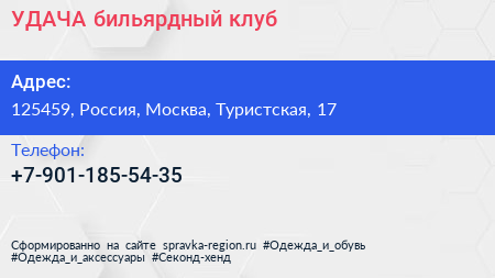 УДАЧА, бильярдный клуб по адресу 125459, Россия, Москва, Туристская, 17 в дальнейшем Организация, размещена в следующих категориях: