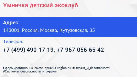 Умничка, детский экоклуб по адресу 143001, Россия, Москва, Кутузовская, 35 в дальнейшем Организация, размещена в следующих категориях: