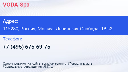 VODA Spa по адресу 115280, Россия, Москва, Ленинская Слобода, 19 к2 в дальнейшем Организация, размещена в следующих категориях:
