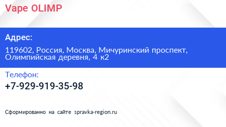Vape OLIMP по адресу 119602, Россия, Москва, Мичуринский проспект, Олимпийская деревня, 4 к2 в дальнейшем Организация, размещена в следующих категориях: