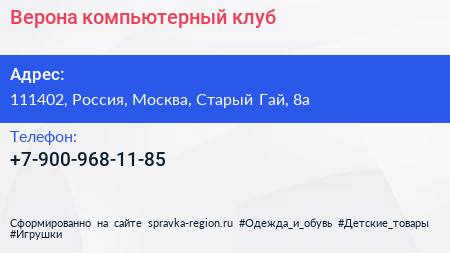 Верона, компьютерный клуб по адресу 111402, Россия, Москва, Старый Гай, 8а в дальнейшем Организация, размещена в следующих категориях: