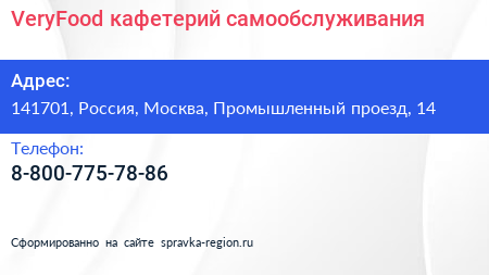 VeryFood, кафетерий самообслуживания по адресу 141701, Россия, Москва, Промышленный проезд, 14 в дальнейшем Организация, размещена в следующих категориях: