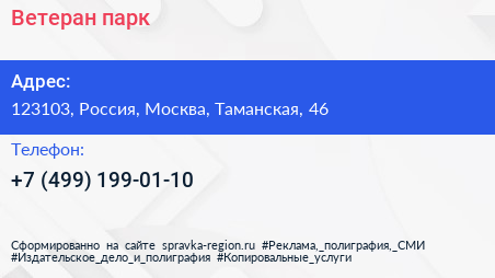 Ветеран, парк по адресу 123103, Россия, Москва, Таманская, 46 в дальнейшем Организация, размещена в следующих категориях: