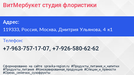 ВитМербукет, студия флористики по адресу 119333, Россия, Москва, Дмитрия Ульянова, 4 к1 в дальнейшем Организация, размещена в следующих категориях: