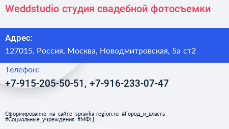 Weddstudio, студия свадебной фотосъемки по адресу 127015, Россия, Москва, Новодмитровская, 5а ст2 в дальнейшем Организация, размещена в следующих категориях: