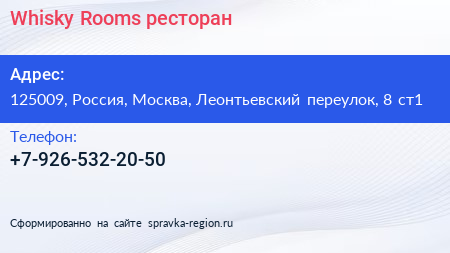 Whisky Rooms, ресторан по адресу 125009, Россия, Москва, Леонтьевский переулок, 8 ст1 в дальнейшем Организация, размещена в следующих категориях: