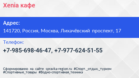 Xenia, кафе по адресу 141720, Россия, Москва, Лихачёвский проспект, 17 в дальнейшем Организация, размещена в следующих категориях: