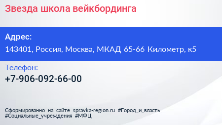 Звезда, школа вейкбординга по адресу 143401, Россия, Москва, МКАД 65-66 Километр, к5 в дальнейшем Организация, размещена в следующих категориях: