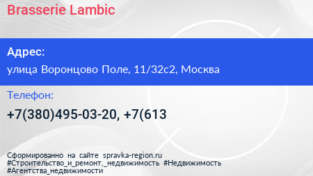 Brasserie Lambic по адресу улица Воронцово Поле, 11/32с2, Москва в дальнейшем Организация, размещена в следующих категориях: