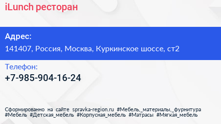 iLunch, ресторан по адресу 141407, Россия, Москва, Куркинское шоссе, ст2 в дальнейшем Организация, размещена в следующих категориях: