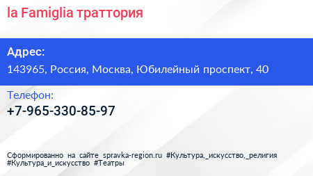 la Famiglia, траттория по адресу 143965, Россия, Москва, Юбилейный проспект, 40 в дальнейшем Организация, размещена в следующих категориях: