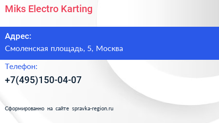 Miks Electro Karting по адресу Смоленская площадь, 5, Москва в дальнейшем Организация, размещена в следующих категориях: