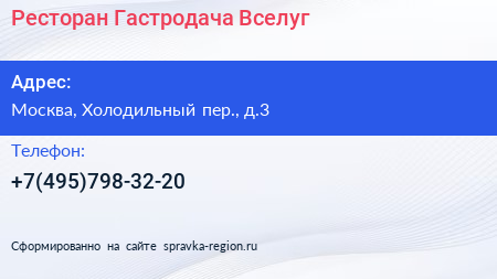 Ресторан «Гастродача Вселуг» по адресу Москва, Холодильный пер., д.3 в дальнейшем Организация, размещена в следующих категориях: