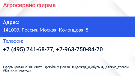 Агросервис, фирма по адресу 141009, Россия, Москва, Колонцова, 5 в дальнейшем Организация, размещена в следующих категориях: