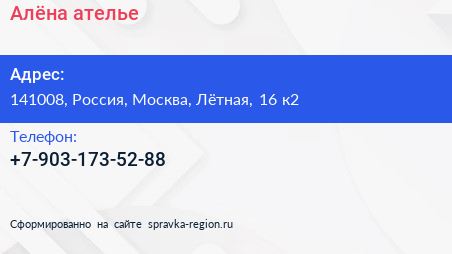 Алёна, ателье по адресу 141008, Россия, Москва, Лётная, 16 к2 в дальнейшем Организация, размещена в следующих категориях: