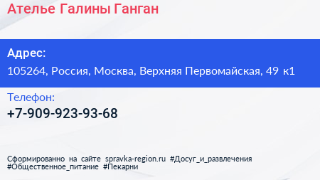 Ателье Галины Ганган по адресу 105264, Россия, Москва, Верхняя Первомайская, 49 к1 в дальнейшем Организация, размещена в следующих категориях: