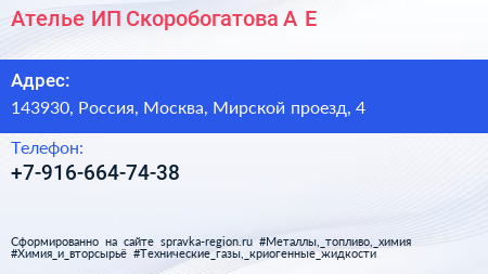 Ателье, ИП Скоробогатова А.Е. по адресу 143930, Россия, Москва, Мирской проезд, 4 в дальнейшем Организация, размещена в следующих категориях: