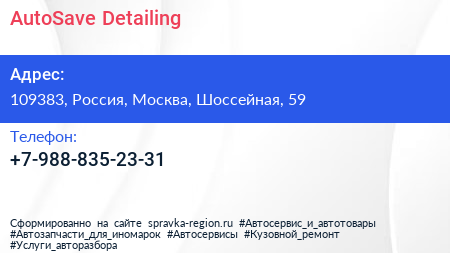 AutoSave Detailing по адресу 109383, Россия, Москва, Шоссейная, 59 в дальнейшем Организация, размещена в следующих категориях:
