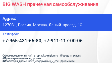 BIG WASH, прачечная самообслуживания по адресу 127081, Россия, Москва, Ясный проезд, 10 в дальнейшем Организация, размещена в следующих категориях: