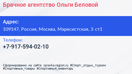 Брачное агентство Ольги Беловой по адресу 109147, Россия, Москва, Марксистская, 3 ст1 в дальнейшем Организация, размещена в следующих категориях: