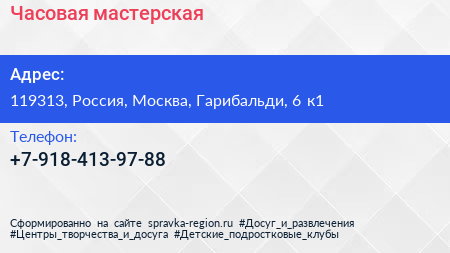Часовая мастерская по адресу 119313, Россия, Москва, Гарибальди, 6 к1 в дальнейшем Организация, размещена в следующих категориях: