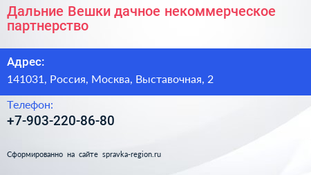 Дальние Вешки, дачное некоммерческое партнерство по адресу 141031, Россия, Москва, Выставочная, 2 в дальнейшем Организация, размещена в следующих категориях: