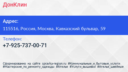ДонКлин по адресу 115516, Россия, Москва, Кавказский бульвар, 59 в дальнейшем Организация, размещена в следующих категориях: