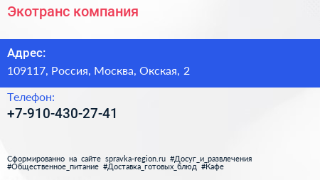 Экотранс, компания по адресу 109117, Россия, Москва, Окская, 2 в дальнейшем Организация, размещена в следующих категориях: