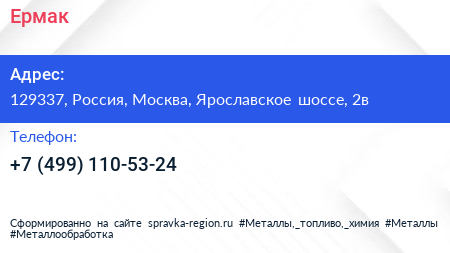Ермак по адресу 129337, Россия, Москва, Ярославское шоссе, 2в в дальнейшем Организация, размещена в следующих категориях: