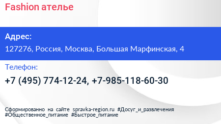 Fashion, ателье по адресу 127276, Россия, Москва, Большая Марфинская, 4 в дальнейшем Организация, размещена в следующих категориях: