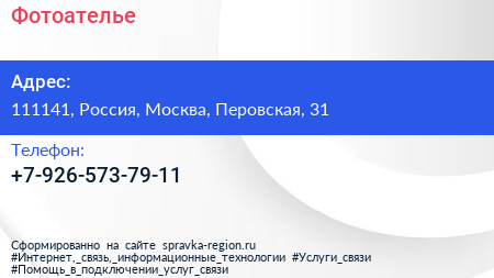 Фотоателье по адресу 111141, Россия, Москва, Перовская, 31 в дальнейшем Организация, размещена в следующих категориях:
