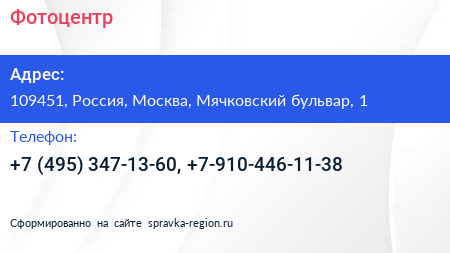 Фотоцентр по адресу 109451, Россия, Москва, Мячковский бульвар, 1 в дальнейшем Организация, размещена в следующих категориях: