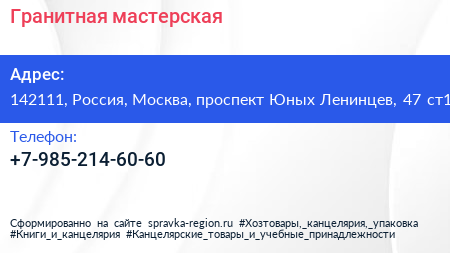 Гранитная мастерская по адресу 142111, Россия, Москва, проспект Юных Ленинцев, 47 ст1 в дальнейшем Организация, размещена в следующих категориях:
