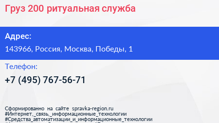 Груз 200, ритуальная служба по адресу 143966, Россия, Москва, Победы, 1 в дальнейшем Организация, размещена в следующих категориях: