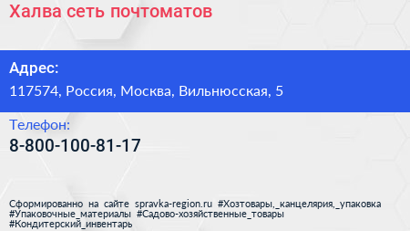 Халва, сеть почтоматов по адресу 117574, Россия, Москва, Вильнюсская, 5 в дальнейшем Организация, размещена в следующих категориях: