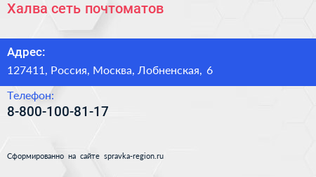 Халва, сеть почтоматов по адресу 127411, Россия, Москва, Лобненская, 6 в дальнейшем Организация, размещена в следующих категориях: