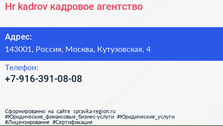 Hr-kadrov, кадровое агентство по адресу 143001, Россия, Москва, Кутузовская, 4 в дальнейшем Организация, размещена в следующих категориях: