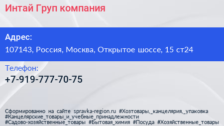 Интай Груп, компания по адресу 107143, Россия, Москва, Открытое шоссе, 15 ст24 в дальнейшем Организация, размещена в следующих категориях: