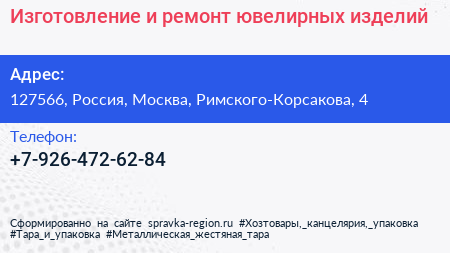 Изготовление и ремонт ювелирных изделий по адресу 127566, Россия, Москва, Римского-Корсакова, 4 в дальнейшем Организация, размещена в следующих категориях:
