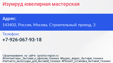 Изумруд, ювелирная мастерская по адресу 143402, Россия, Москва, Строительный проезд, 3 в дальнейшем Организация, размещена в следующих категориях: