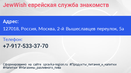 JewWish, еврейская служба знакомств по адресу 127018, Россия, Москва, 2-й Вышеславцев переулок, 5а в дальнейшем Организация, размещена в следующих категориях: