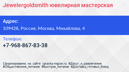 Jewelergoldsmith, ювелирная мастерская по адресу 109428, Россия, Москва, Михайлова, 4 в дальнейшем Организация, размещена в следующих категориях: